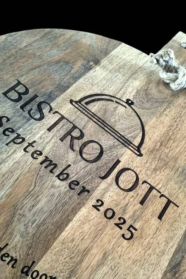 De Borrelplank Mangohout rond 40cm voorzien van een ingraveerde tekst, een boodschap of bedrijfslogo.