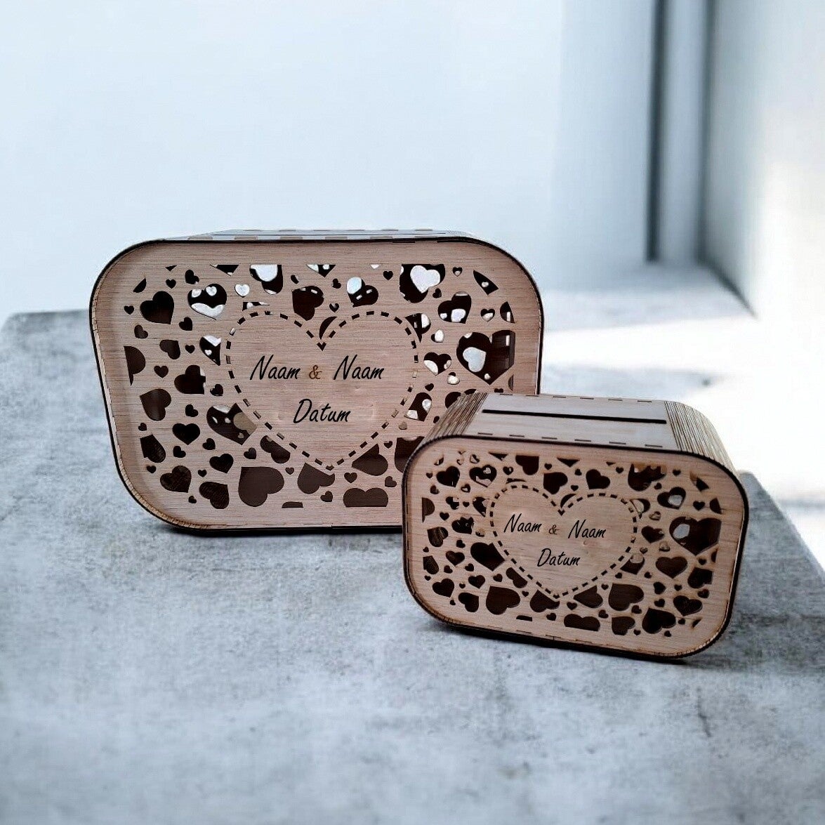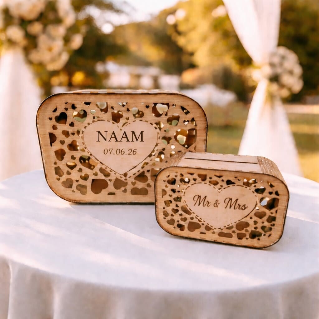 Een prachtige houten enveloppendoos om alle kaarten en gelukswensen te verzamelen op jullie grote dag. Stijlvol, persoonlijk en een blijvende herinnering aan jullie bruiloft.