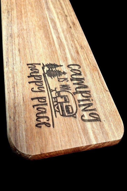 De camping serveerplank / borrelplank wordt voorzien van een gegraveerde tekst of afbeelding uit één van onze voorbeelden.